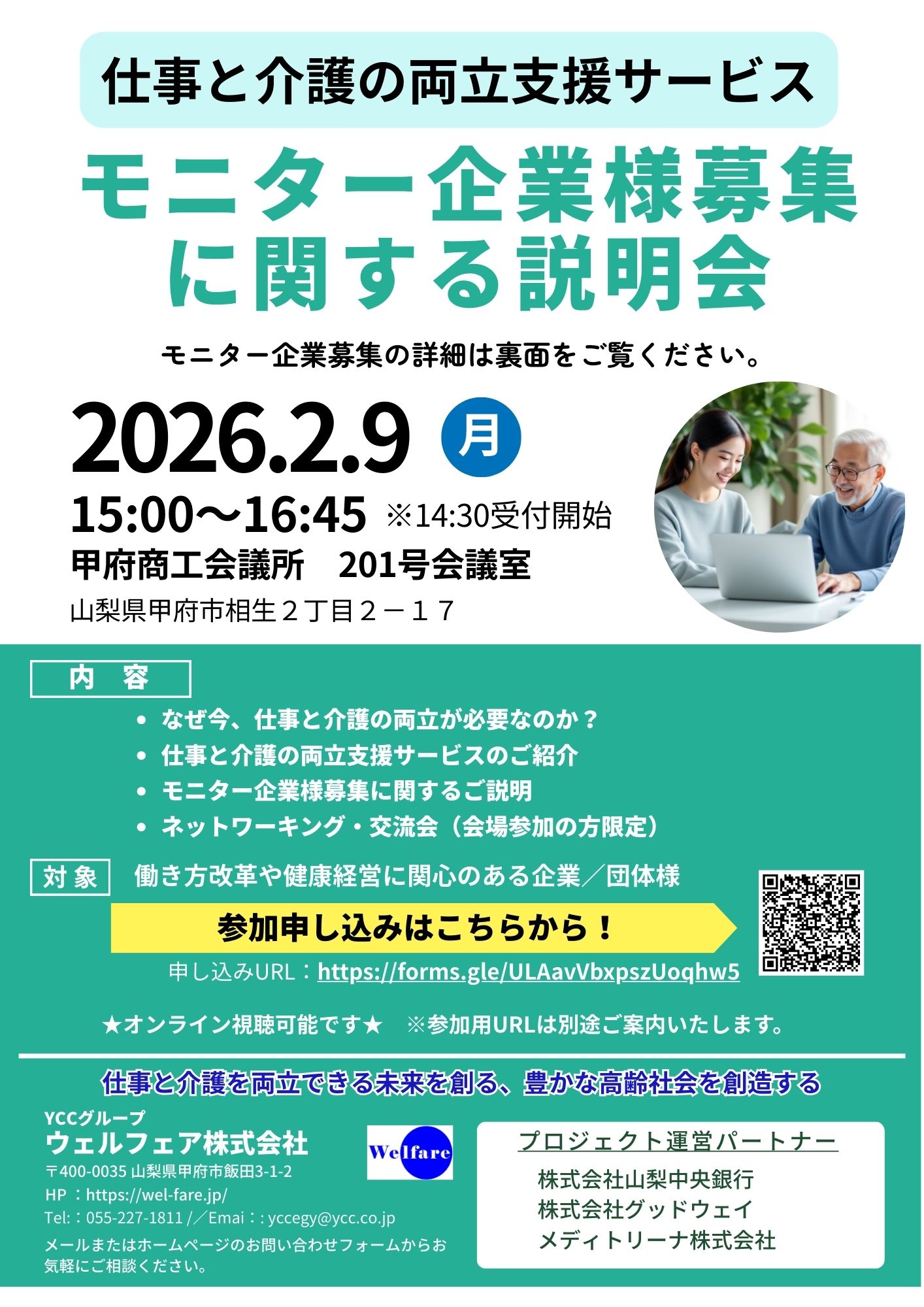 ウェルフェア株式会社(YCCグループ)を代表企業とする、私たち未来共創研究カンパニーでは、仕事と介護を両立できる未来を創り、豊かな高齢社会を創造することを目指し、企業・団体の皆様をサポートする新サービスを展開いたします 。
