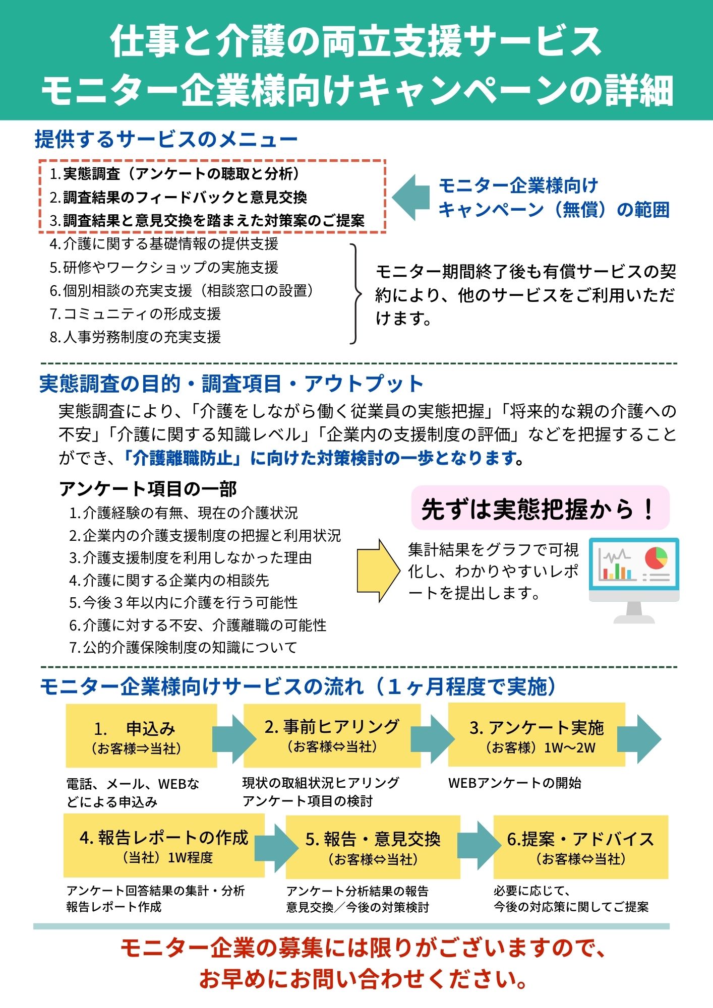 本説明会では、なぜ今「仕事と介護の両立支援」が経営に必要なのかという背景から、具体的なサービス内容、そして無償で貴社の現状を可視化できる「モニターキャンペーン」の詳細についてご案内します 。